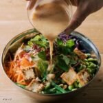 Tips:まずは葉物と絡めてシンプルにチョレギサラダに。紫キャベツ、枝豆、人参、いんげん、ミント、ピーナッツにかけて、ざっくりと混ぜ合わせたチョップドサラダにもおすすめ。食感のポイントに厚揚げを入れました。
