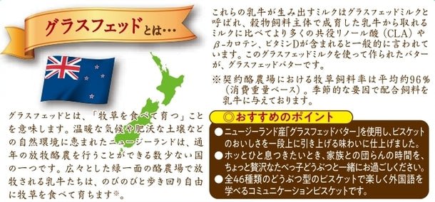 口あたりが軽く上品なコクとあっさりした味わいでバター特有のくどさがなく飽きずに食べすすめられます。ホッとひと息つきたいとき、家族との団らんの時間を、ちょっと贅沢なたべっ子どうぶつと一緒にお過ごしください。全46種類のどうぶつ型のビスケットで楽しく外国語を学べるコミュニケーションビスケットです。