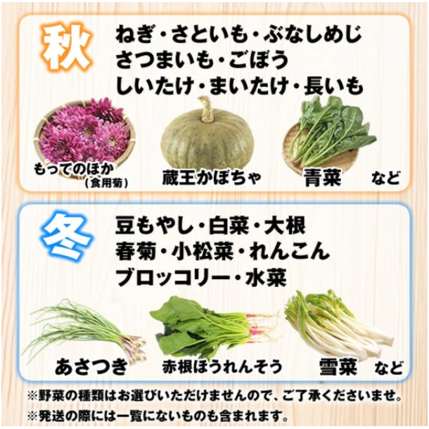 ※季節によって上記以外の野菜・果物・山菜などが入る場合がございます。