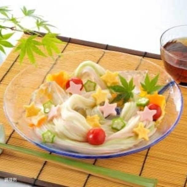 色麺がたくさん入った「彩り華やか絹そうめん」は見た目の楽しくお子様に人気! 7月7日七夕に「そうめんを食べると1年間無病息災で過ごせる」という言い伝えもあります。 七夕そうめんに願いを込めて☆
