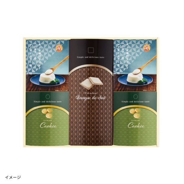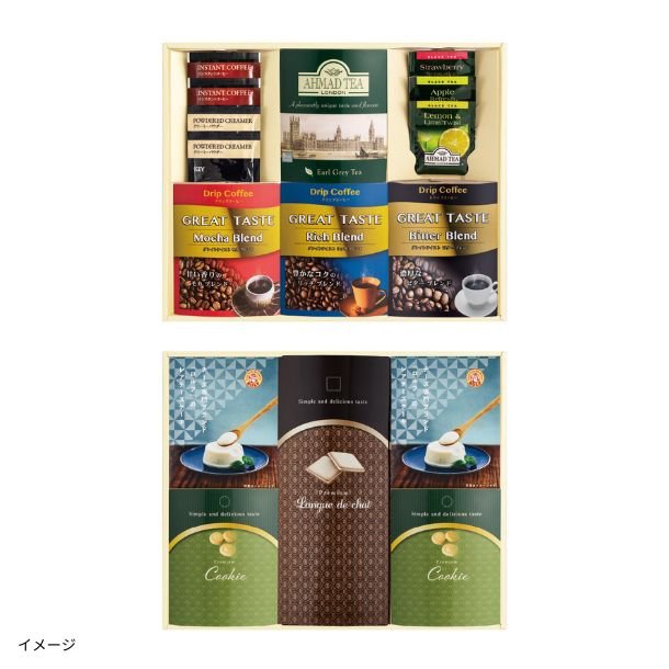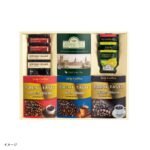ロルフレアチーズケーキ、バニラクッキー、ラングドシャ、KEYCOFFEEドリップコーヒー、KEYCOFFEEインスタントコーヒー、KEYCOFFEEクリームパウダー、アーマッドアールグレイ紅茶、アーマッドフルーツティー3種の詰め合わせです。