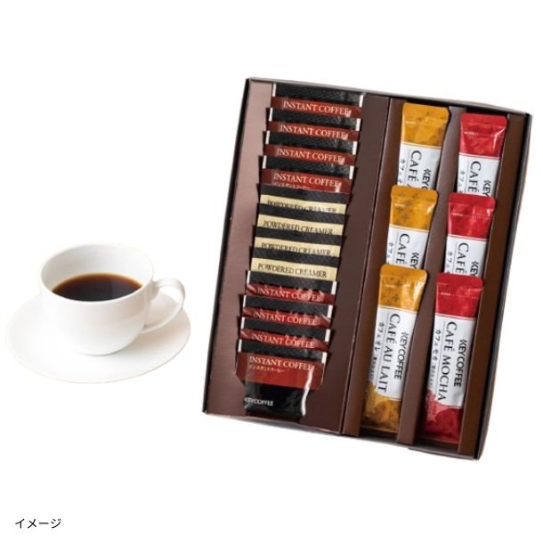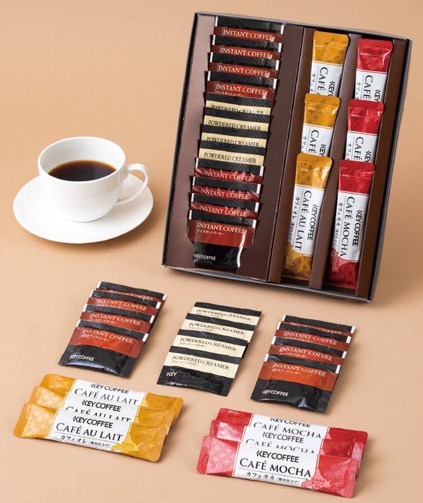 KEYCOFFEEカフェオレ贅沢仕立て、KEYCOFFEEカフェモカ贅沢仕立て、KEYCOFFEEインスタントコーヒー 、KEYCOFFEEクリーミーパウダーの詰め合わせです。