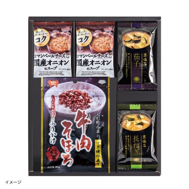 オニオンスープ、牛肉そぼろふりかけ、京懐石味噌汁の詰合せです。京懐石味噌汁は、茄子・豆腐・長ねぎ・野菜の中からランダムで2袋入ります。種類はお選びいただけません。