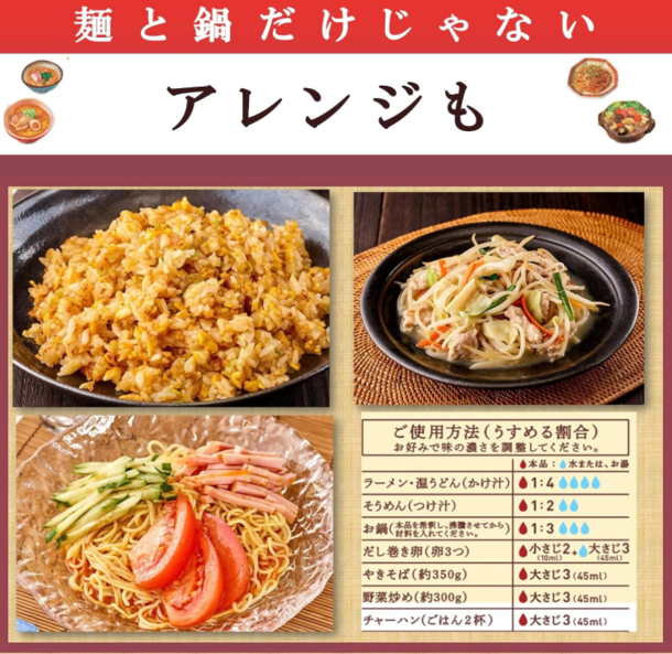 温かい麺料理(温うどん・ラーメン)、野菜炒め・チャーハン、冷たい麺料理(そうめん・冷たいうどん)・鍋などに使用でき、毎日の食事の味わいのバリエーションが広がります。ごま油と鶏油で炒めたニンニクと韓国産唐辛子のコクがある旨みと、食をそそるほどよい辛さが特徴です。濃縮タイプで、500mlペットボトル容器入りです。