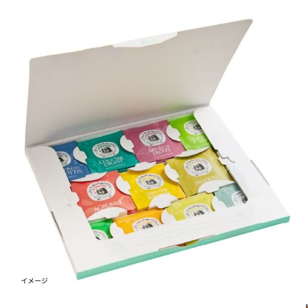 11種類(オリジナル、ティユール、タイム、カモミール、バーベナ、フェンネル、ミント&リコリス、シトラスブレンド、ピュリフィエ、フルーツブレンド、コクテルディジェスト)を各2袋入れたアソートパックです。