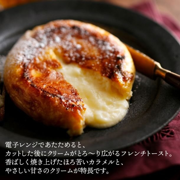 温かい濃厚クリームがとろーり広がる。表面のほろ苦い焦がしカラメルとクリームの優しい甘さが絶妙。見た目にも思わず“にやっ”とするトレンドスイーツ。