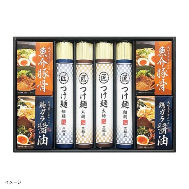 魚介豚骨味と鶏ガラ醤油味のつけ麺つゆに、太さの違う2種類のつけ麺を詰め合わせました。