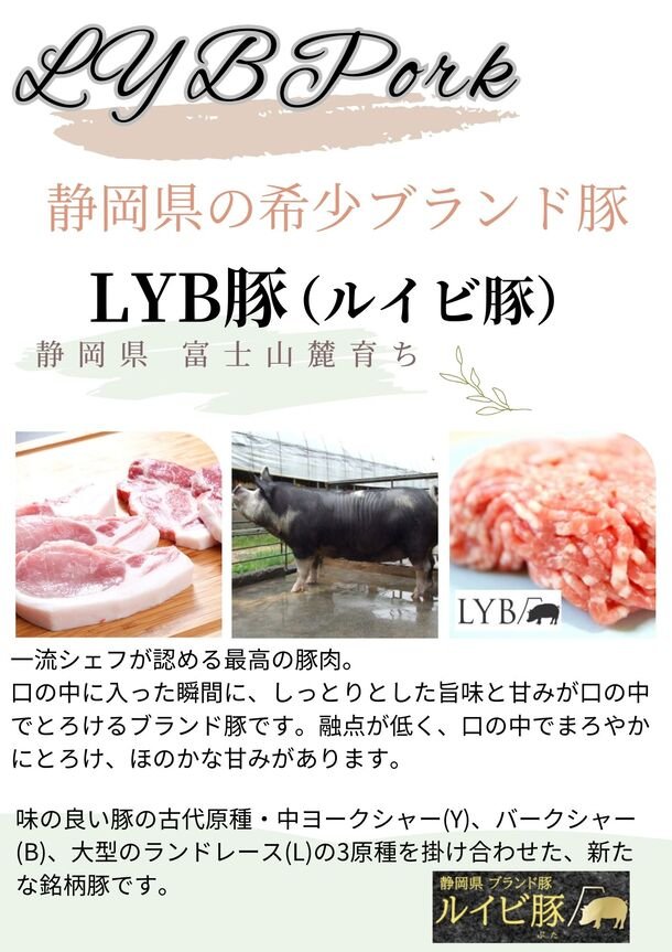 ●三元豚の脂身の融点が約38度であるのに対し、LYB豚の脂身の融点がチョコレートと同じ32.5 度と低いのが大きな特徴です。口の中に入った瞬間に、今迄の常識を超えた「しっとりとした旨味と甘み」が口の中でとろけます。又、脂がしつこくなく軽いので、豚肉の脂身が苦手という方でも美味しく食べられるほどの違いがあります。