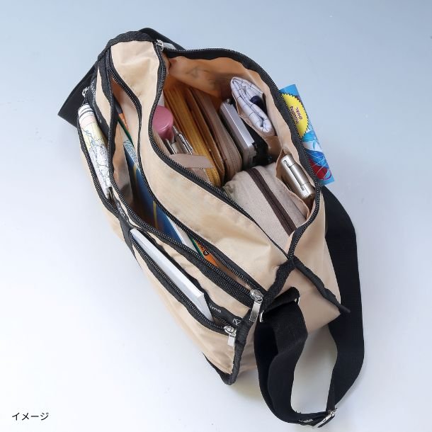 落ち着いた配色でコーデに合わせやすい豊富なポケットデザインのショルダーバッグです。
