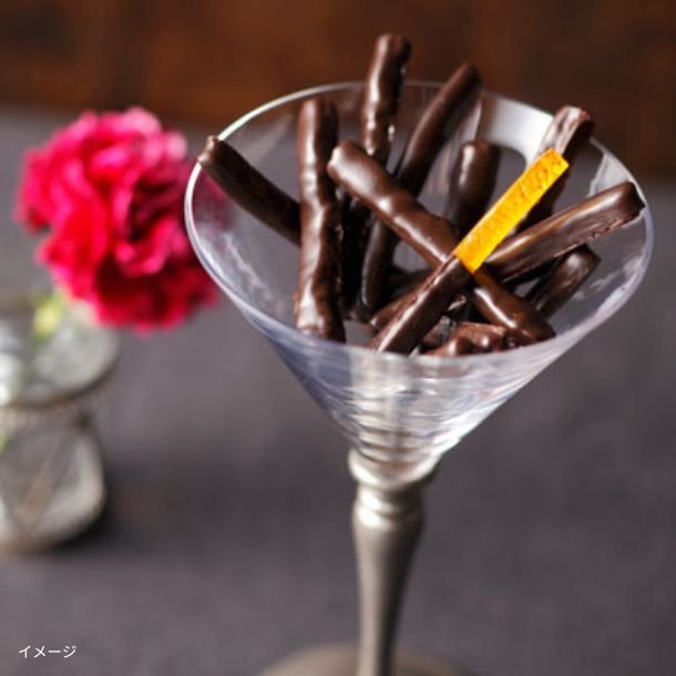 オレンジのグラッセをオレンジリキュールで漬け込みビターチョコレートでコーティングしました。その柔らかな皮の食感は、これまでのオレンジピールとは一線を画します。
