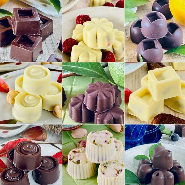 ビター・ホワイトチョコは、宮崎綾町産自然栽培の栗やブルーベリー、日向夏・オレンジを粗糖で煮込んで作ったジャム、アーモンドやヘーゼルナッツ、クルミ、ノンオイルクランベリー、アプリコットと有機粗糖で作った自社製ペースト、自社製レモンジュレの14種類。