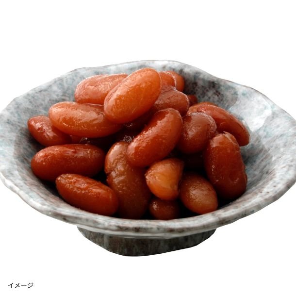 原材料のうずら豆には、うずらのような模様が入っており、細長いのが特徴です。この豆をおやつとして、また、おかずとして食べられるようあっさりとした甘さで、柔らかく食べやすい一品に仕上げました。