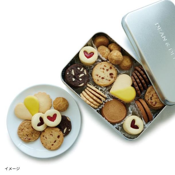 DEAN & DELUCAのロゴの入ったシルバー缶に、11種類のアメリカンクッキーをつめあわせました。アイシングやジャムサンド、キャラメル、ナッツ、スパイスを使用したクッキーなど、様々な味わいが楽しめるアメリカンクッキーが11種、全部で45枚も入ったクッキー缶。お子様のいるご家庭の贈りものに、オフィスの差し入れに。