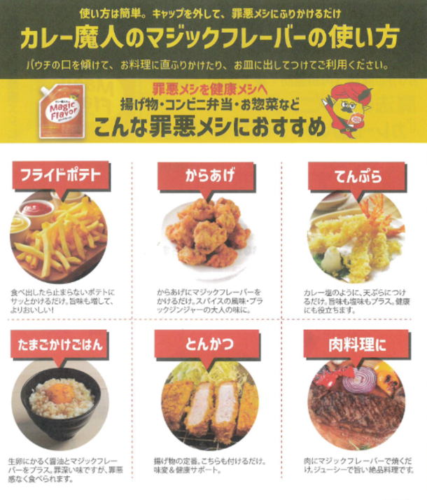 化学調味料は一切使用せず、酵母エキスなどで旨味をプラス。製法特許出願中の製法で、ポテトやからあげ等、料理のうまさをマジックフレーバーがさらに引き出し“悪魔的な美味しさ”に仕上げます。
