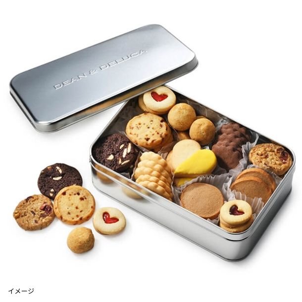 DEAN & DELUCAのロゴの入ったシルバー缶に、11種類のアメリカンクッキーをつめあわせました。 アイシングやジャムサンド、キャラメル、ナッツ、スパイスを使用したクッキーなど、様々な味わいが楽しめるアメリカンクッキーが11種、全部で45枚も入ったクッキー缶。