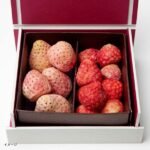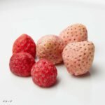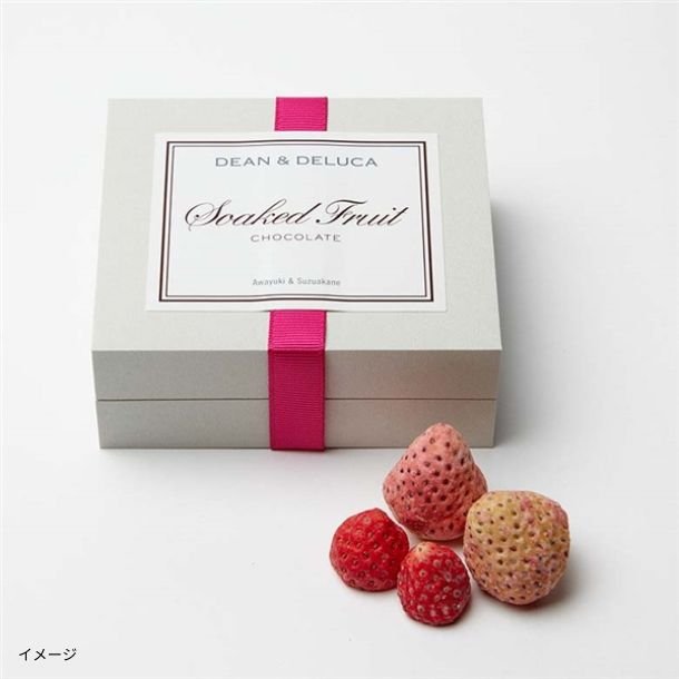 希少で、甘みがつよく、見た目も美しい、白いちご「淡雪」と、ほどよく酸味が感じられ、チョコレートと相性のよい小粒の「すずあかね」の組み合わせ。そのまま食べてもおいしい上質な国産フルーツを使用し、生のフルーツの仕入れから、カット、チョコレートを染み込ませるまで、一貫して手作業で丁寧に作られており、見た目の美しさも光る逸品。