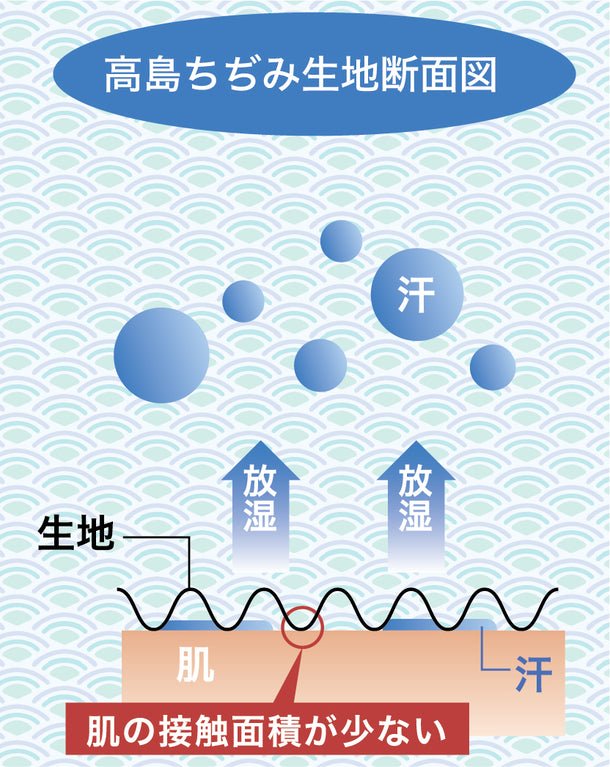 高島ちぢみ独特の凹凸「しぼ」により、汗をかいても肌につく面積が少なく、肌に張り付きにくい。