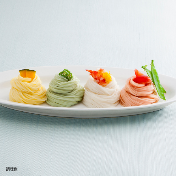 手延素麺独特のコシとのどごしはそのままに、トマト・かぼちゃ・オクラの夏野菜で季節感と色彩をそなえた三輪素麺。