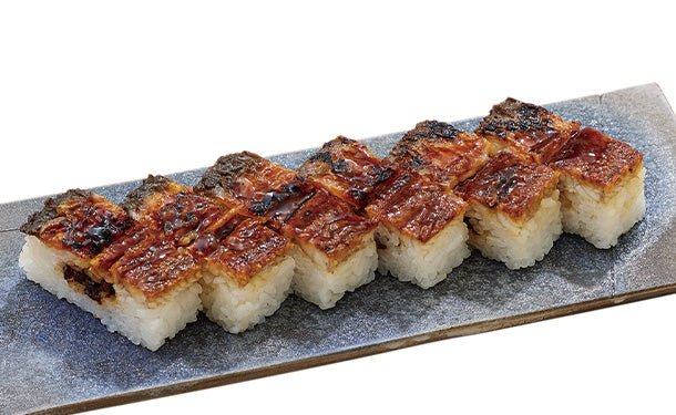 伝統的な上方鮨の技術で作った、うなぎの押し寿司。椎茸とかんぴょうの旨味を加えた優しい甘さがうなぎの旨味を引き立てます。 具材とシャリの考えられたバランスが美味しい押し寿司です。