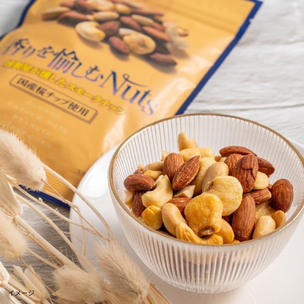 アーモンド、カシューナッツ、落花生、ジャイアントコーンを、国産桜チップでじっくりと燻製しました。